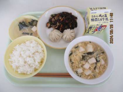 今日の献立は、ご飯  にら玉汁  もずくのチャプチェ  えび包子  牛乳  でした。