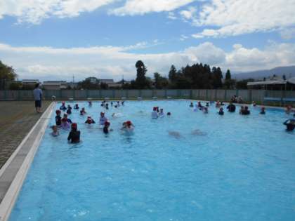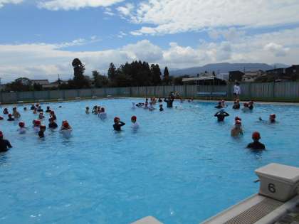 5年生の体育科のプールの学習です。プールの底におなかをつけたりだるま浮きをしたりしました。