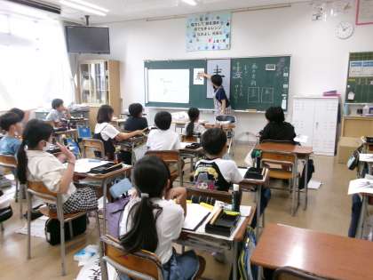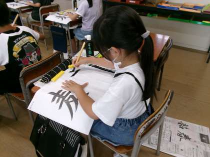 書写では、字形に気を付けながら「左右」を書きました。2つある左はらいの関係に注意して、丁寧に取り組んでいます。