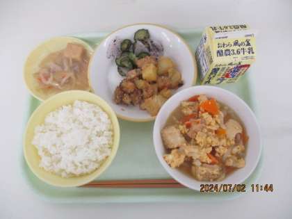 今日の献立は、ご飯 親子煮 魚とじゃがいものごまからめ ゆかり和え 牛乳でした。
