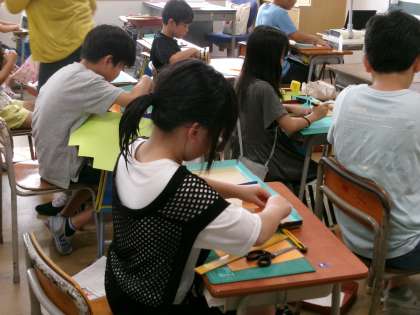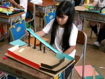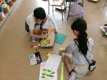 ビー玉を転がすコース作りもいよいよ終盤にさしかかってきました。厚紙を使ってすべり台やトンネル、落とし穴を作るなど、工夫を凝らした作品が多く見られます。休み時間にも積極的に作成を進めながら、お互いの作品の良いところを伝え合っていました。
