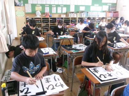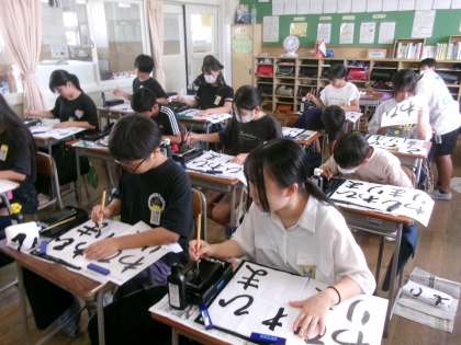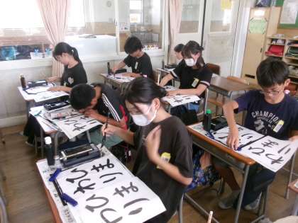 書写では、点画のつながりを意識して「ひまわり」を書きました。練習を重ねることで、字形を整えて書くことができました。