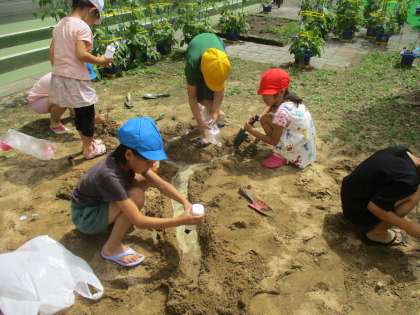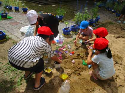 子供たちは、「山を作ってトンネルにする」「通路を作って水を流す」「型抜きを使ってお店屋さんを開く」「マヨネーズなどの入れ物に水を入れて飛ばす」など、自分で考え遊びで友達と仲良く遊んでいました。振り返りでは、たくさんの感想が出ました。またひとつ、学校の楽しい場所が増えたようです。