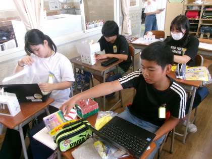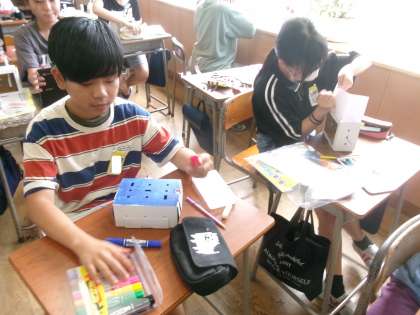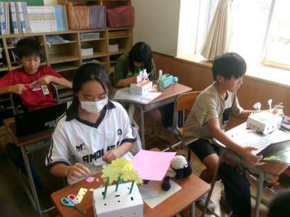 図工科「くるくるクランク」の学習で進めていた作品づくりも完成が近づいています。クランクの動きをよく観察した作品が仕上がっています。