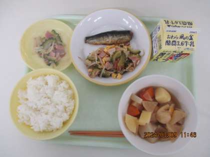今日の献立は、 ご飯 ベーコンとゴーヤの卵炒め 炊き合わせ いわしの梅煮 牛乳 でした。
