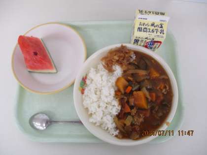 今日の献立は、夏野菜カレー 福神漬け すいか 牛乳 でした。
