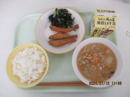 今日の献立は、 ご飯 冬瓜のそぼろあん わかさぎのフリッター ひじきのごま和え 牛乳 でした。