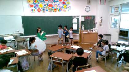「おおきなかぶ」劇の発表会の様子です。それぞれの役を堂々と発表しました。グループの絆が深まりました。