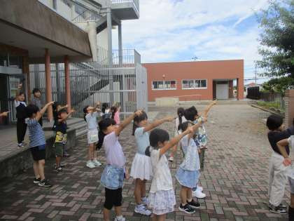 8月28日(水)1年生 国語「いちねんせいのうた」 公開日 2024/08/28 更新日 2024/08/28 1年生 「いちねんせいのうた」を読んで、教科書の文にあった「あおいそらのこくばんに」「まっすぐいちねんせいの一」を実際に外に出てやってみました。場面を想像しながらみんなで空に向かって書いていました。