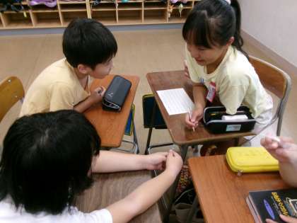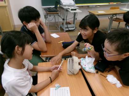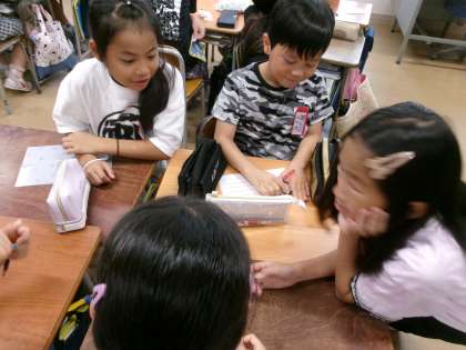 2学期に入り、朝のチャレンジタイムでは夏休みの思い出を共有したり、学級ごとに楽しい遊びをしたりしています。今日は班で協力してお題に合った答えを出し、他の班とかぶらないようにすることを目指す「かぶらナイス」という活動をしました。各班協力して取り組みながら、さらに仲を深めている様子が見られました。