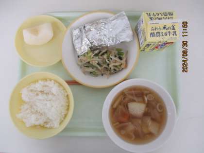今日の献立は、ご飯 さばの銀紙焼き 冬瓜スープ はりはり和え 梨 牛乳 でした。