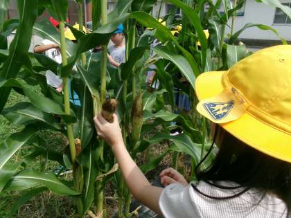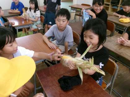 畑のとうもろこしの様子を見に行きました。今年の2年生は、「イエローポップ」というポップコーン用のとうもろこしを育ています。ずいぶん枯れてきていたので、試しに5本収穫してみました。皮をむいてみると、「とうもろこしのにおいがするね」と話していました。