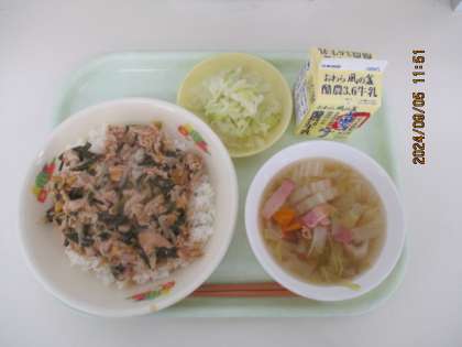 今日の献立は、、豚キムチ丼 はくさいスープ ゆでキャベツ 牛乳 でした。