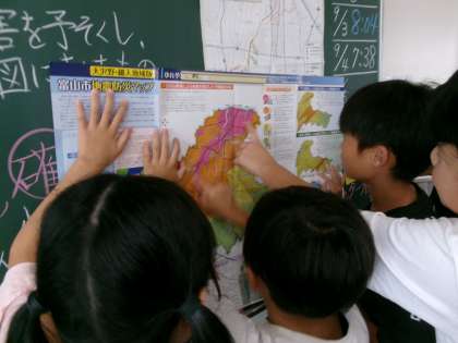 社会では、自然災害からくらしを守る工夫について学習しています。自分たちが住んでいる地域の危ない場所はどこか、災害が起きたらどこに避難すればよいのか、などを確認しました。ぜひ、ご家庭にあるハザードマップを一緒に確認してみてください。