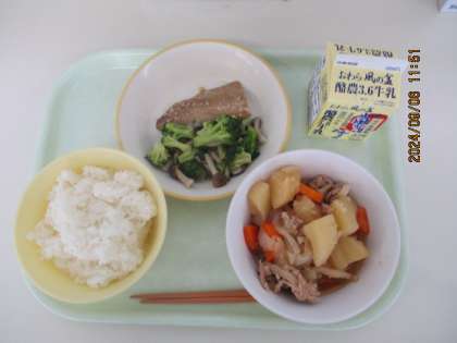 今日の献立は、ご飯  トマト肉じゃが  にしんの照り煮  ブロッコリーときのこのソテー  牛乳  でした。