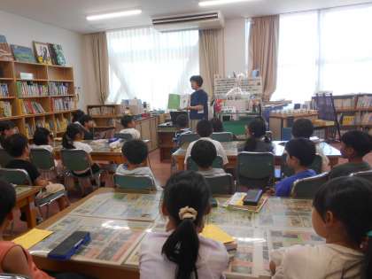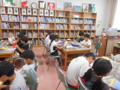 子供たちが楽しみにしていた、一週間に一度の図書室の時間がありました。司書の先生に、海洋プラスチックについての絵本の読み聞かせをしてもらました。その後、本を借り、静かに読書をして過ごしました。