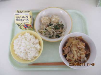 今日の献立は、ご飯 回鍋肉 小籠包 チンゲンサイひたし 牛乳 でした。