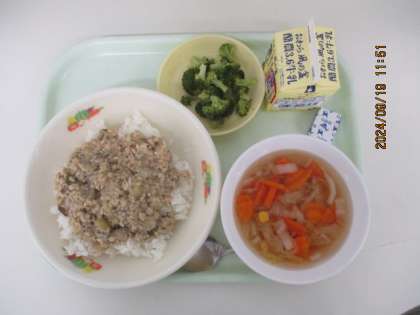 9月19日(木) 今日の給食 公開日 2024/09/19 更新日 2024/09/19 給食室から 今日の献立は、とやまのえごま入りガオパライス コーンスープ ゆでブロッコリー ポケットチーズ 牛乳 でした。 ちなみに、ガオパライスはインドネシアの料理だそうです。