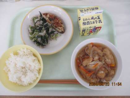 今日の献立は、ご飯 沢煮椀 魚のかば焼き 梅肉和え 牛乳 でした。