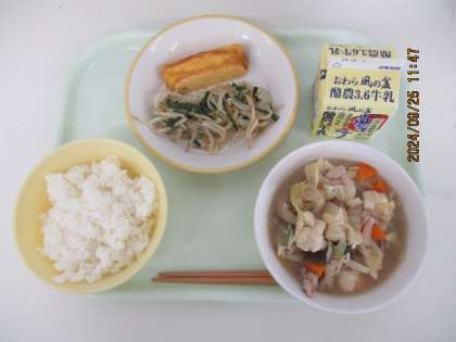 今日の献立は、ご飯 肉豆腐 厚焼き卵 香味和え 牛乳 でした。