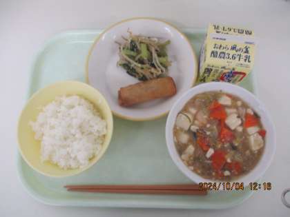 今日の献立は、ご飯 えびと豆腐のうま煮 春巻き 小松菜のごまひたし 牛乳 でした。