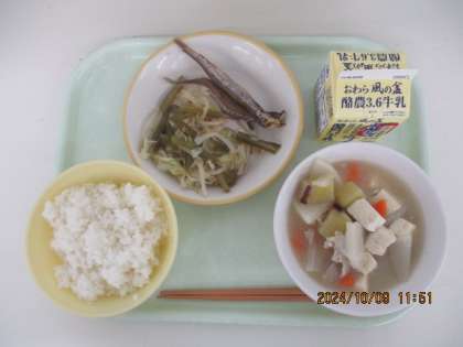 今日の献立は、ご飯 さつま汁 ししゃもの米粉揚げ 茎わかめの酢の物 牛乳 でした。