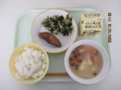 今日の献立は、ご飯 なめこ汁 揚げ魚のレモン味 磯和え 牛乳 でした。