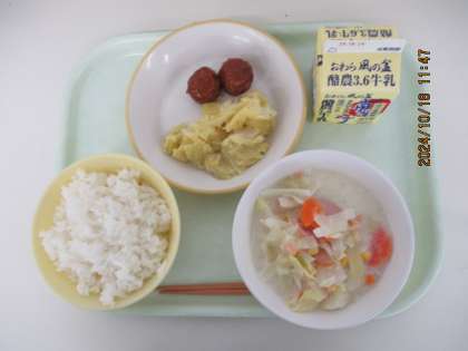 今日の献立は、ご飯  豆乳野菜スープ  ミートボール  チーズおさつ  牛乳  でした。