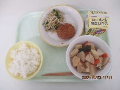 今日の献立は、 ご飯 おでん メンチカツ ごまひたし 牛乳 でした。