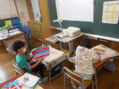 2年生 図工 公開日 2024/10/24 更新日 2024/10/24 2年生 「ふしぎなたまご」の学習をしました。画用紙に、先週絵の具で描いたふしぎなたまごを貼り、たまごの中から何がでてきたものを思い思いに描きました。