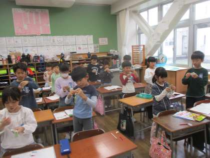 算数科では、繰り上がりのたしざんカードの練習をしました。初めは答えを見ながら、慣れてきたら答えを見ないですらすら言えるよう、練習を繰り返していきます。