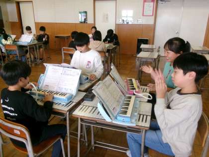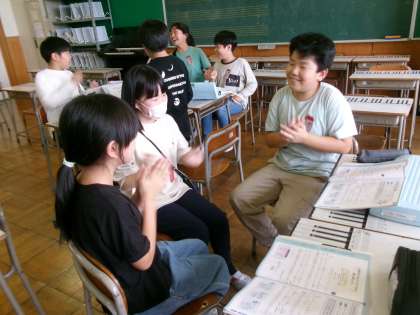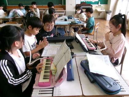 音楽では「クラッピングファンタジー 楽しいマーチ」の学習をしています。今日は班ごとの発表会に向けて、手拍子1・手拍子2・鍵盤ハーモニカに分かれて練習しました。