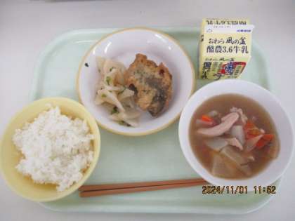 今日の献立は、ご飯 根菜汁 魚のえごま揚げ かぶの色どり 牛乳 でした。