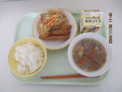 11月5日(火) 今日の給食 公開日 2024/11/05 更新日 2024/11/05 給食室から 今日の献立は、ご飯 サムゲタンスープ わかさぎのフリッター バンサンスー 牛乳 でした。 サムゲタンスープは、韓国の料理だそうです。