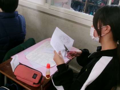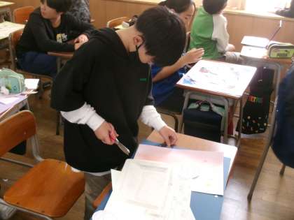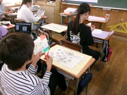 図工で制作してきた作品の仕上げを行いました。風景画や水彩で描いた絵を組み合わせて台紙に貼りました。