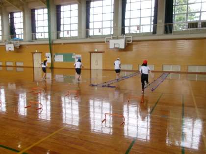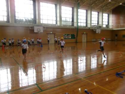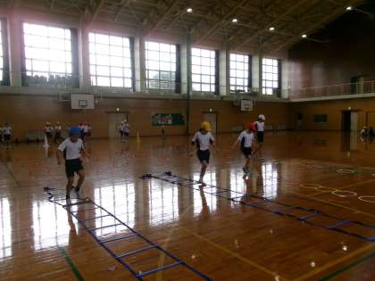 11月6日(水) 4年生 体育 公開日 2024/11/07 更新日 2024/11/07 4年生 小型ハードル走に取り組んでいます。今日は小型ハードルに加えて輪やラダーなども使い、各チームごとに速さを競いました。
