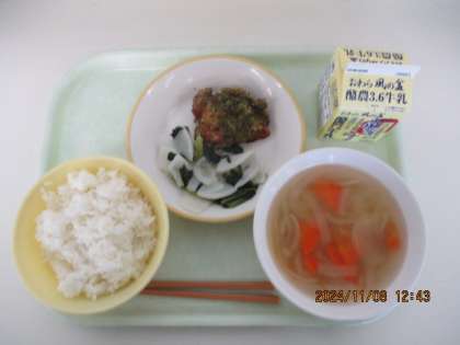 今日の献立は、ご飯 豚肉の磯部揚げ ポテトスープ かぶのサラダ 牛乳 でした。