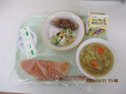 11月11日(月) 今日の給食 公開日 2024/11/11 更新日 2024/11/11 給食室から 今日は、「学校給食とやまの日」にちなんだ献立で、富山の食材がたくさん使われました。米粉コッペパン とやま野菜のカレースープ 魚の白ネギソースかけ はくさいサラダ ラフランスヨーグルト 牛乳 でした。