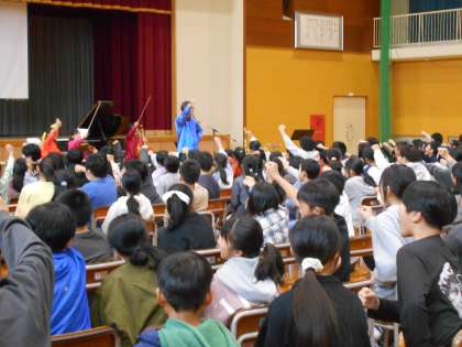 楽器の紹介や合奏など、子供たちは体でリズムをとりながら聴いたり、心地よい楽器の音色に耳を傾けたりしていました。特に、「みんなでつくる音楽ものがたり『〇〇〇のぼうけん』」では、子供たちも参加して、楽しく音楽ものがたりをつくり上げました。