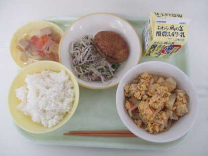 今日の献立は、ご飯 卵とじ 照焼ハンバーグ ゆかり和え 牛乳 でした。