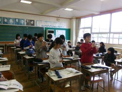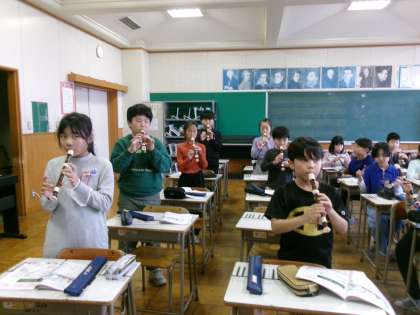 11月15日(金) 4年生 音楽 公開日 2024/11/16 更新日 2024/11/16 4年生 音楽の授業では、「陽気な船長」という曲をリコーダーで演奏しています。スタッカートと、そうでないところのタンギングの仕方に気を付けながら吹きました。