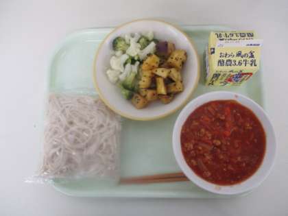 11月19日(火) 今日の給食 公開日 2024/11/19 更新日 2024/11/19 給食室から 今日の献立は、子供たちの大好きなソフト麺でした。ソフト麺のミートソースかけ 大学芋 花野菜サラダ 牛乳 でした。