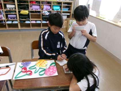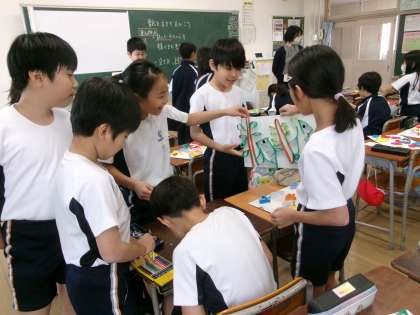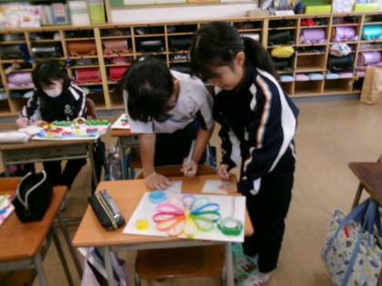 11月19日(火) 4年生 図工1 公開日 2024/11/19 更新日 2024/11/19 4年生 今日は「線を立てて描こう」の鑑賞をしました。友達の作品をよく観察して、色や形の工夫、さらには向きによって見えるものに違いがあることなどを発見していました。