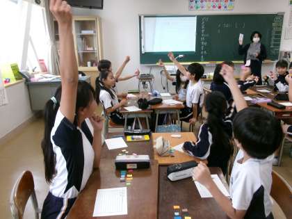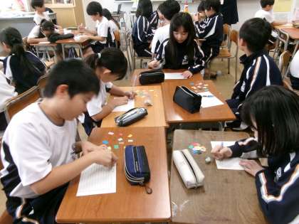 11月19日(火) 4年生 図工2 公開日 2024/11/19 更新日 2024/11/19 4年生 2時間目の図工では、色に関するクイズをしました。「うれしい」「かるい」「ごつごつ」など、お題の言葉に合う色を選んで出し合いました。班の中でも違う色を選んでいる人がいることに気付き、それぞれの感性を認め合っています。