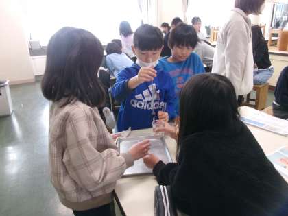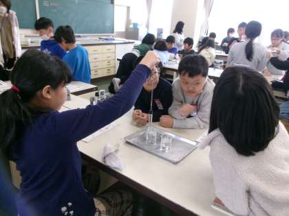 11月26日(火) 4年生 理科 公開日 2024/11/26 更新日 2024/11/26 4年生 空気と水のあたたまり方の実験をしています。班のメンバーで協力しながら、興味津々で結果をのぞき込んでいます。