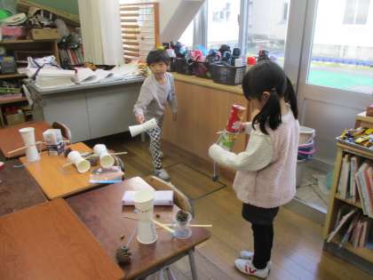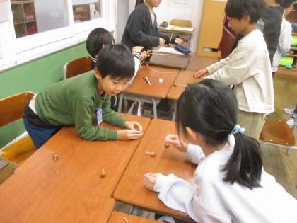 「あきをたのしもう」の学習の最終日です。自分や友達のおもちゃで遊んで気付いたことや感想を発表しました。遊んでみると、おもちゃにたくさん工夫があったことや使う材料を変えると、同じおもちゃでも違ったおもしろさがあることに気付きました。まだまだ遊び足りない子供もいるようです。自分たちのおもちゃをみんなで作ったり遊んだりすることがとても楽しかったようです。(写真は、おもちゃで遊んだときの写真です。)