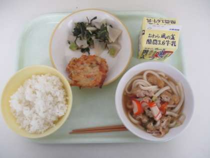 11月26日(火) 今日の給食 公開日 2024/11/26 更新日 2024/11/26 給食室から 今日は、学校給食とやまの日。富山県の食材を使用したおかずがたくさん登場しました。献立は、ご飯 野菜かき揚げうどん やちゃら(かぶと小松菜の昆布和え) 牛乳 でした。