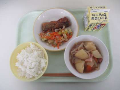 きょうの献立は、 ご飯 魚の竜田揚げ ベーコンとじゃがいもの煮物 甘酢和え 牛乳 でした。