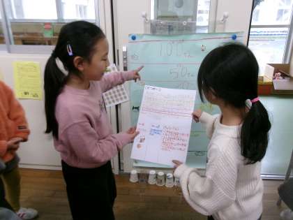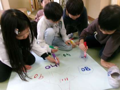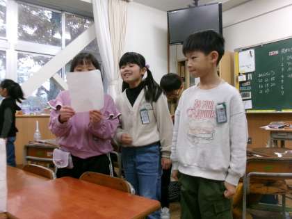 生活科の学習では、作ったおもちゃで1年生と一緒に遊ぶ準備をしています。おもちゃの特徴に合わせて的を作ったり、景品を作ったりしています。1年生に分かりやすく説明するために、お互いに聞き合って練習しています。