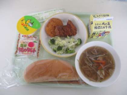12月2日(月) 今日の給食 公開日 2024/12/02 更新日 2024/12/02 給食室から 今日は、セレクトメニュー献立でした。豚肉の米粉揚げまたは、えびかつ はちみつレモンゼリー コッペパン ワンタンスープ 添え野菜 牛乳 でした。